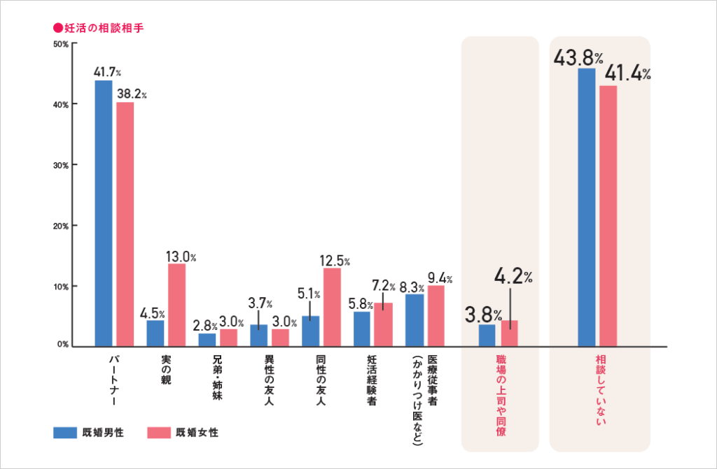 既婚男女の妊活の相談相手について、職場の上司・同僚への相談は、男性(3.8%)、女性(4.2%)とほとんどの方がしておらず、そもそも男女の4割以上が誰にも相談していないことが明らかになった。
