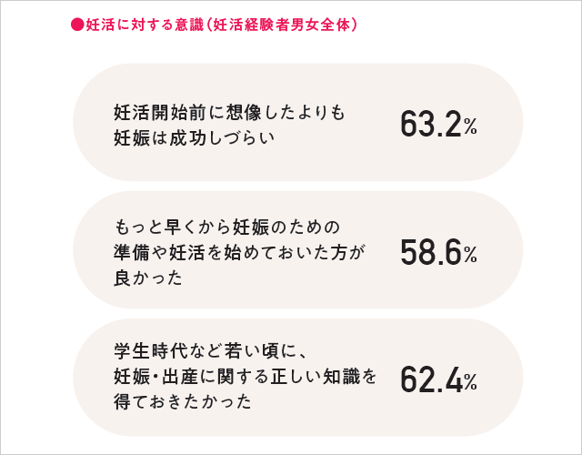 その他、約6割が「学生時代など若い頃に、妊娠・出産に関する正しい知識を得ておきたかった」(全体:62.4% 男性:61.2%、女性:63.5%)、「もっと早くから妊娠のための準備や妊活を始めておいた方が良かった」(全体:58.6% 男性:58.5%、女性:58.6%)と回答し、知識・準備不足であったことを感じている。