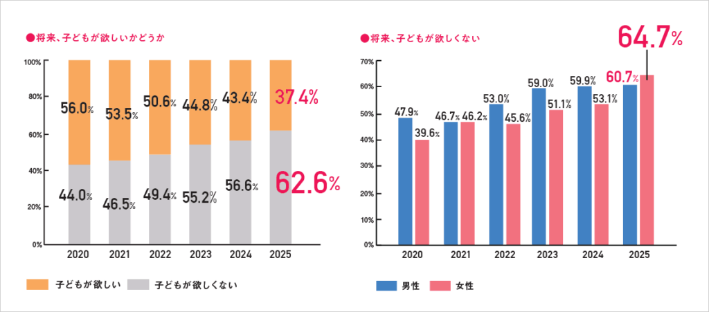 ロート製薬「妊活白書2025」によると、若年未婚男女(18-29才・子どもはいない)において子どもを望まないという回答が、2018年の調査以降、初めて女性(64.7%)が男性(60.7%)を上回る結果となった。