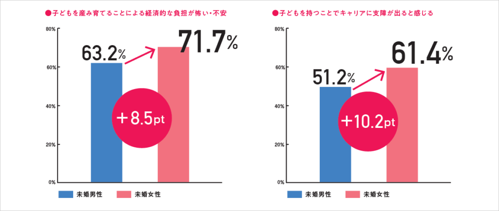 若年未婚男女において、「結婚・出産・子育てや生活・人生に対する意識」に対して、男性よりも女性が、子どもを産み・育てることによる「経済的な負担」と「仕事のキャリアへの支障」をより不安視している。その差は、女性がおよそ10pt高い結果に。