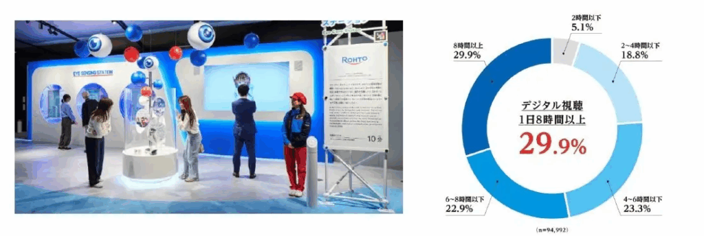 ロート製薬は13日、2025 年大阪・関西万博の大阪ヘルスケアパビリオンに出展した「ミライのアイケア」ブースにおいて、体験者 10 万人以上の目の健康データを収集・解析した。その結果、約3割の人が平日8時間以上デジタル視聴を行い、視聴時間が長い人ほど目の不調を実感する割合が高いことが判明。さらに、「目年齢」を一つの指標として、現代人が抱える目の実態や肌との関係が明らかになった。