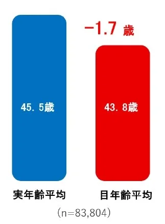 ・ 万博会場で測定する「目年齢」、平均は43.8歳となり、実年齢の平均(45.5 歳)を下回る結果となった。