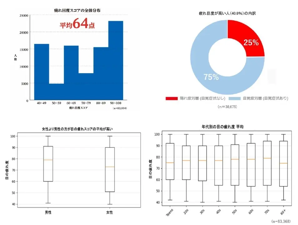 ・ 体験者の平均疲れ目度スコアは64点。60点以上の人で6割を超え、さらに80点以上の人で4割を占めた。
