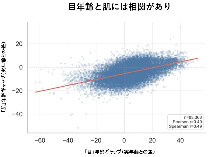 ・ 目年齢と肌の若さに相関関係が見いだされた。また目年齢と肌スコアの個別項目でみると、「目袋」と「シワ」が目年齢と相関があることが確認された。