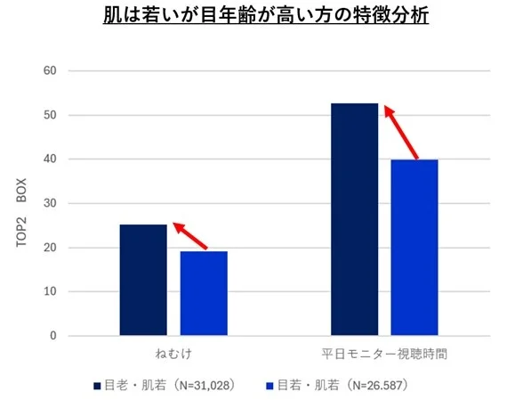 ・ 肌スコアは若いのに「目」年齢が実年齢より高い人が4割もいて、この層を比較分析すると、日中の眠気を感じている人が多く(TOP2 差分:6.0pt)、またモニターの視聴時間が長い(TOP2 差分:12.3pt)ことが確認された。