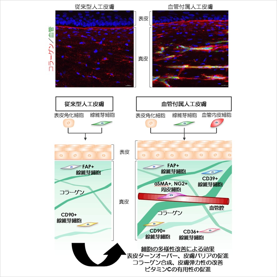 図1.血管を付与する事で、ヒトの真皮間葉系細胞多様性とその機能を高度に再現した人工皮膚が開発された。
