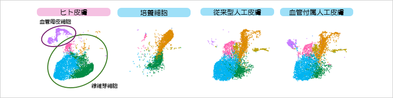 正常ヒト表皮角化細胞、正常ヒト真皮線維芽細胞、ヒト臍帯血管内皮細胞の 3 種の細胞を使用して、①シャーレ上で培養した3種の培養細胞、②表皮角化細胞と真皮線維芽細胞の2 種の細胞で構築した従来型人工皮膚、③従来型人工皮膚に血管内皮細胞を組み込んだ血管付属人工皮膚を構築し、各サンプルの細胞について単一細胞 RNA シークエンス解析を実施。得られた網羅的遺伝子発現プロファイルデータを公開ヒト皮膚細胞データと統合したうえで主成分分析し、更に遺伝子発現の類似した細胞をクラスリングし、その結果を UMAP に二次元プロットし、遺伝子発現の類似した細胞集団を可視化した(ロート製薬研究所実施)。