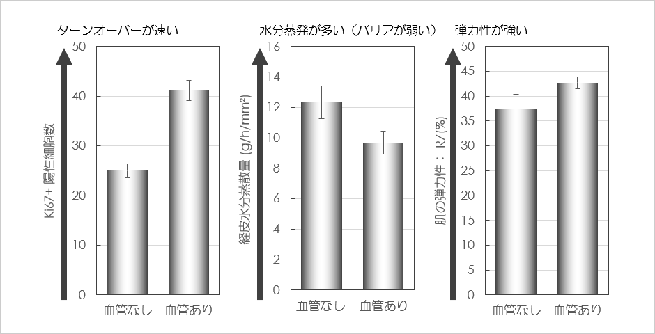 次に、血管の有無による人工皮膚の機能性を比較した。その結果、肌の保湿バリア機能、透明感等に重要な役割を果たすターンオーバー機能、しわたるみに関わる肌の弾力性について、血管付与による改善が認められた(図3)。