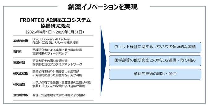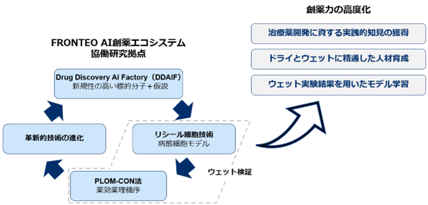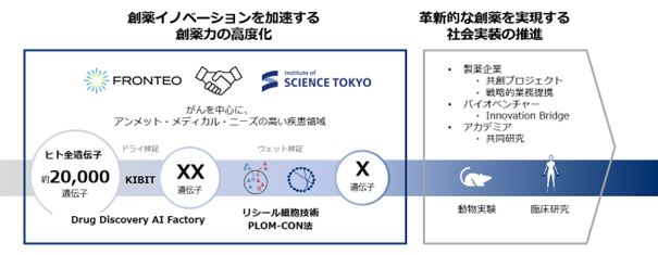 同拠点では、FRONTEOがAI「KIBIT」を用いた創薬標的分子候補の抽出および作用メカニズムの仮説構築(ドライ研究)を行い、東京科学大学が実験検証(ウェット研究)を迅速に実施する。さらに、実験結果を再びAI解析に還元することで、仮説生成と検証を循環させる「仮説検証ループ」を高水準で実現し、創薬成功確率の飛躍的な向上を目指す。