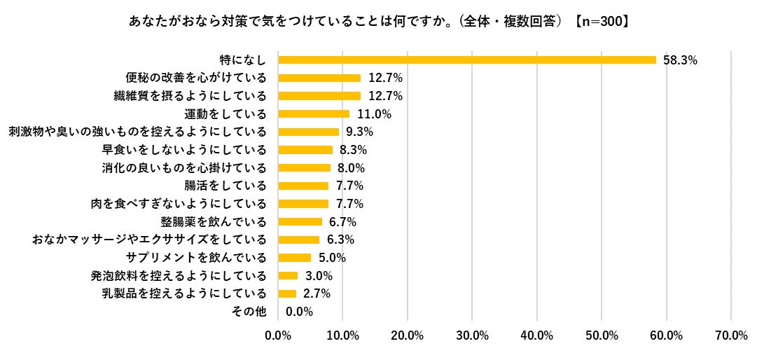 ◆おなら対策で気をつけていることは「特になし」(58.3%)の回答が多く、それ以外の回答もばらついているため、対策方法が分からず対処できていない可能性が高い。