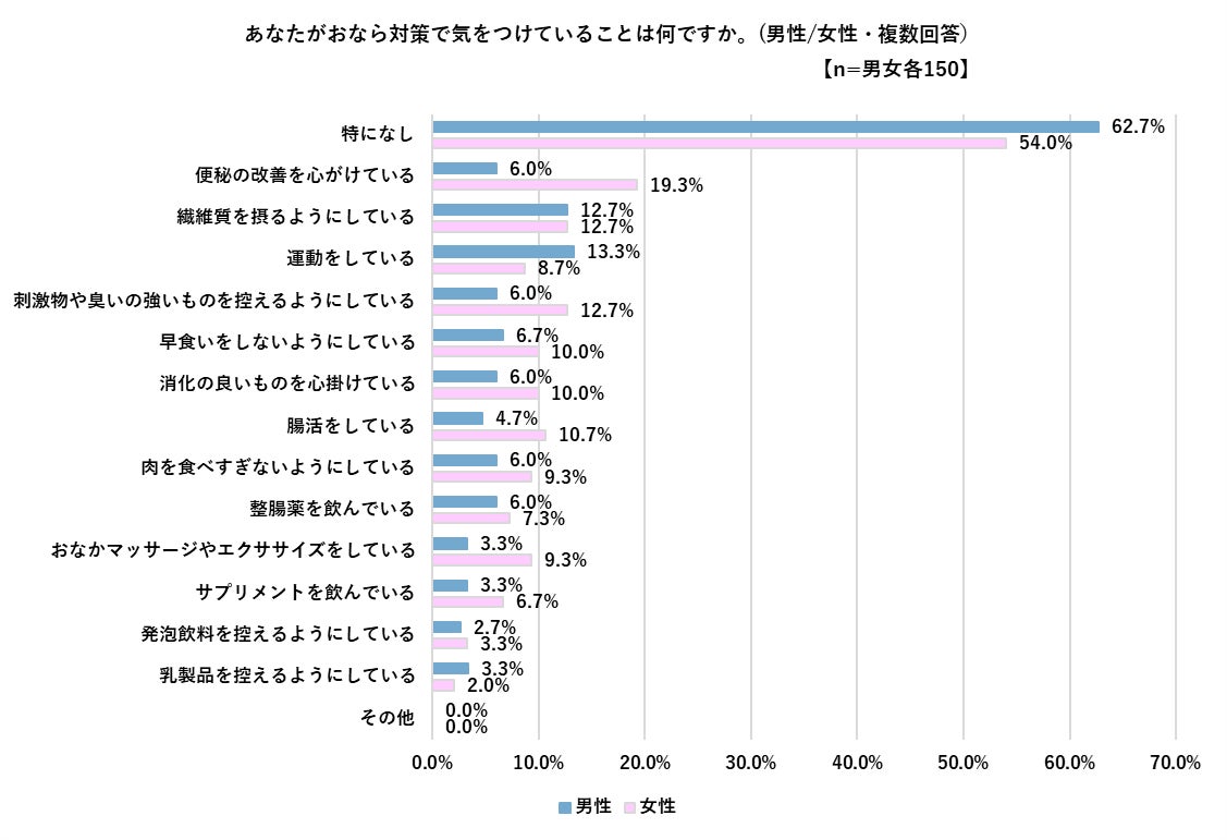 おなら対策で気をつけていることについて聞いたところ、「特になし」が最も多く 58.3%であった。女性の回答では5人に1人が「便秘の改善を心がけている」( 19.3%)と回答。便秘に悩む女性の多さを改めて認識させられる結果となった。