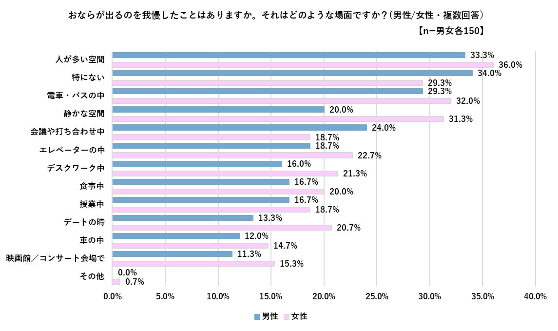 ◆おならが出るのを我慢した場面について、女性の回答は「人が多い空間」(36.0%)や「電車・バスの中」(32.0%)、「静かな空間」(31.3%)が上位を占め、男性は「特にない」(34.0%)の回答が 1 位に。