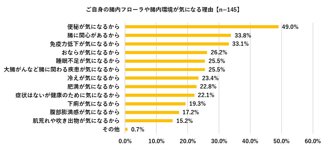 「自分の腸内フローラや腸内環境が気になるか?」という質問に対して、「はい」と回答した145人にその理由を聞いたところ、「おならが気になるから」という回答は4 番目に多く、約3割(26.2%)の人がおならと腸内環境が関係していると考えていることが分かった。