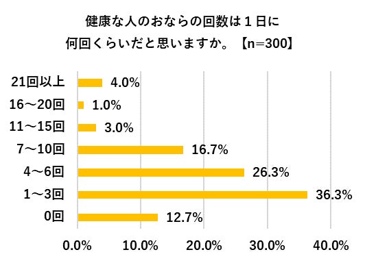 また、健康な人のおならの回数は1日に何回ぐらいだと思うかについても聞いてみたところ、「3 回以下」と回答した人が49.0%(「0 回:12.7%」+「1~3回:36.3%」)とほぼ半数に。