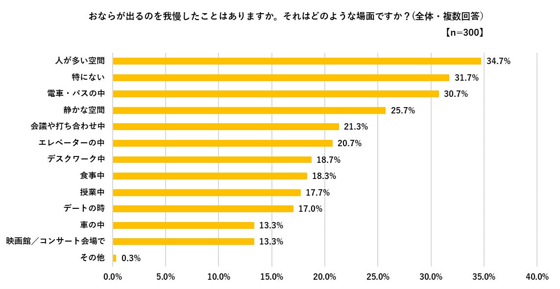 「人が多い空間」で、おならが出るのを我慢したことがあるとの回答が 34.7%と最も多くなった。その内、女性は「人が多い空間」(36.0%)や「電車・バスの中」(32.0%)、「静かな空間」(31.3%)で我慢しているのに対し、男性は「特にない」(34.0%)と答えた人が最も多い結果となったた。