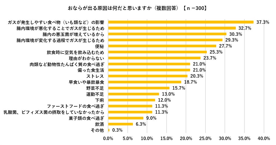 おならが出る原因で多かった回答は、1位が「ガスが発生しやすい食べ物(いも類など)の影響」(37.3%)、続いて「腸内環境が悪化することでガスが生じるため」(32.7%)、「腸内の悪玉菌が増えているから」(30.3%)であった。食べた物や腸内環境が原因と考える人が多いことが分かった。